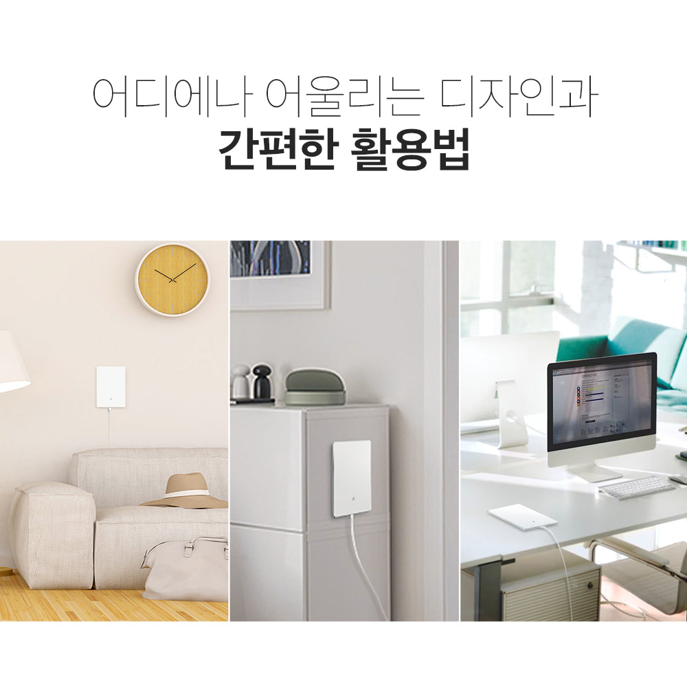 - 다양한 설치 방법을 지원하는 컴팩트 디자인: 똑바로 세우거나 뒤집어도 쓸 수 있고, 책상 거치, 벽면 설치, 천장 설치, 기둥 설치를 지원합니다.