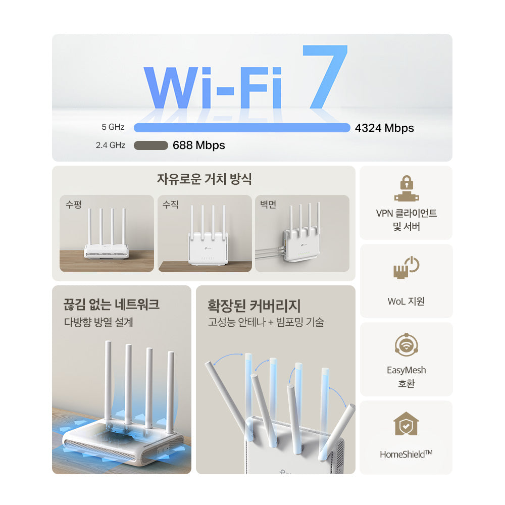 - 다양한 설치 방법을 지원하는 컴팩트 디자인: 똑바로 세우거나 뒤집어도 쓸 수 있고, 책상 거치, 벽면 설치, 천장 설치, 기둥 설치를 지원합니다.