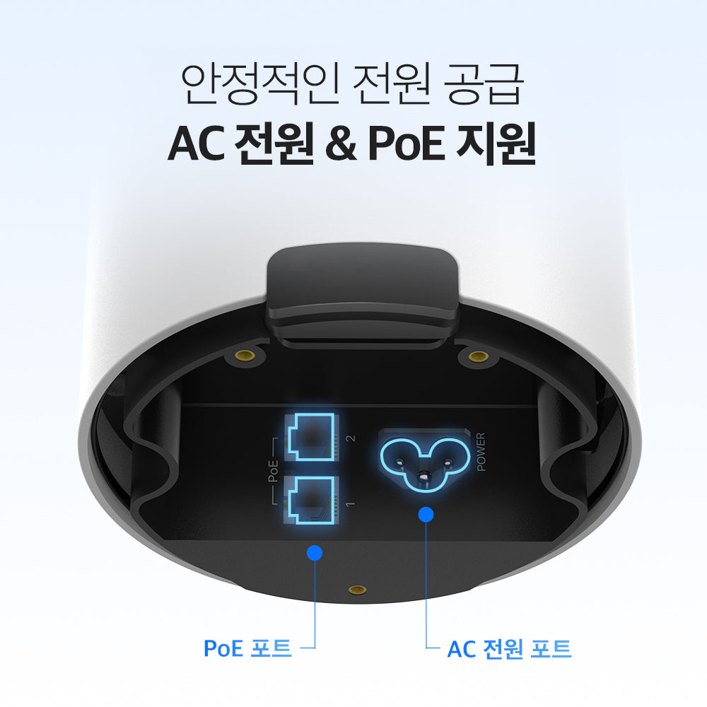 - 다양한 설치 방법을 지원하는 컴팩트 디자인: 똑바로 세우거나 뒤집어도 쓸 수 있고, 책상 거치, 벽면 설치, 천장 설치, 기둥 설치를 지원합니다.