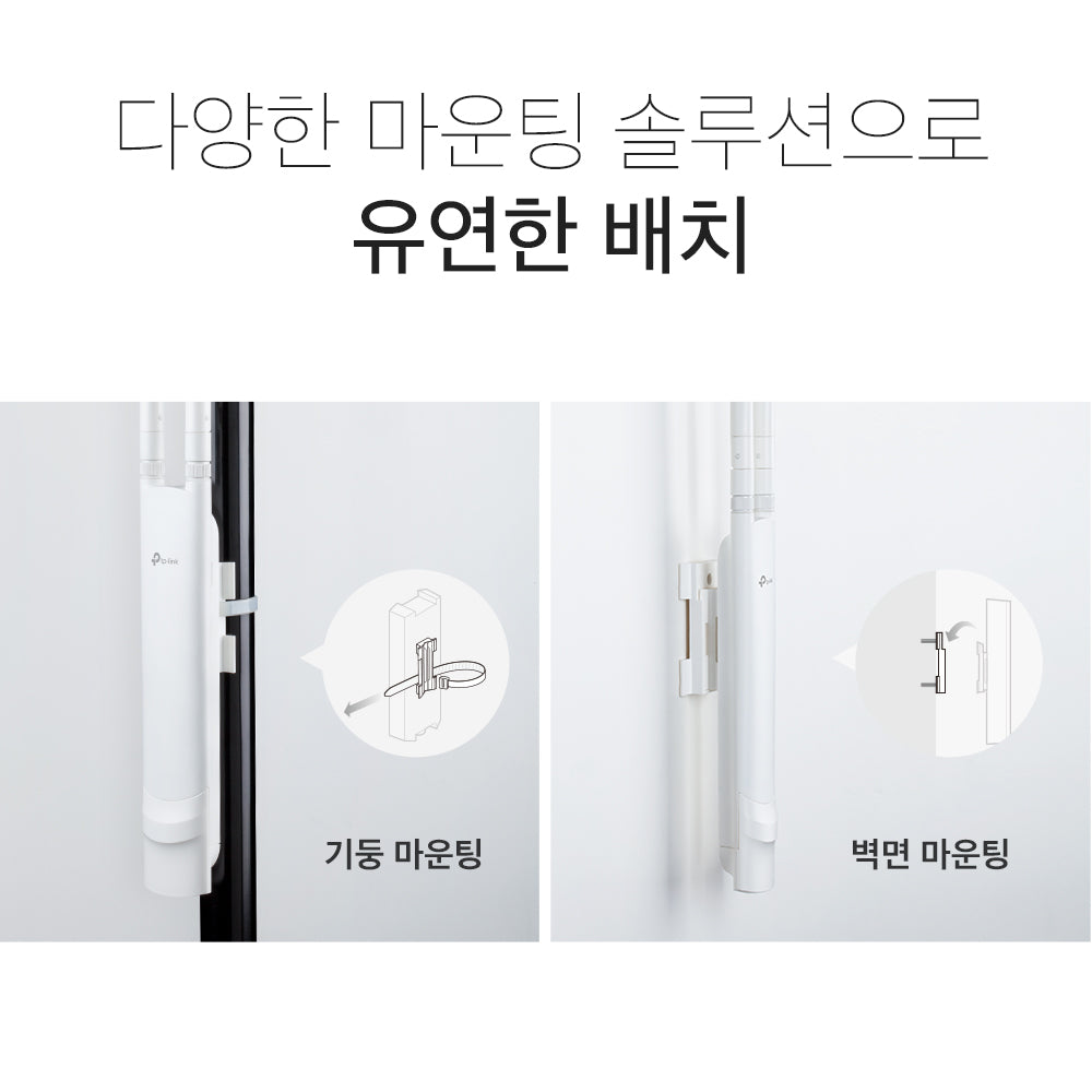 - 다양한 설치 방법을 지원하는 컴팩트 디자인: 똑바로 세우거나 뒤집어도 쓸 수 있고, 책상 거치, 벽면 설치, 천장 설치, 기둥 설치를 지원합니다.