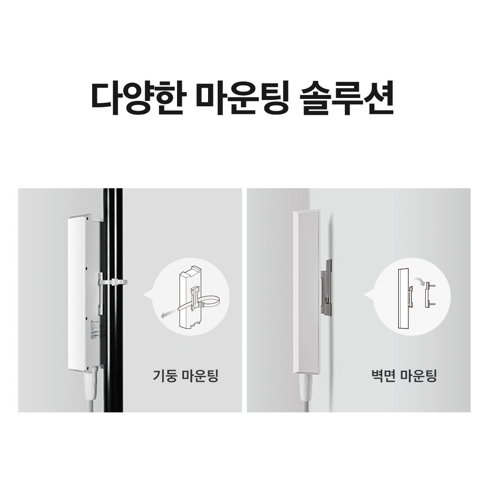- 다양한 설치 방법을 지원하는 컴팩트 디자인: 똑바로 세우거나 뒤집어도 쓸 수 있고, 책상 거치, 벽면 설치, 천장 설치, 기둥 설치를 지원합니다.
