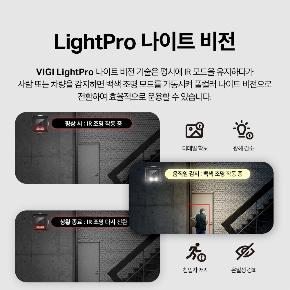- 소리 및 조명 경보: 소리와 조명 경보로 주의를 끌어 침입자를 쫓아냅니다.