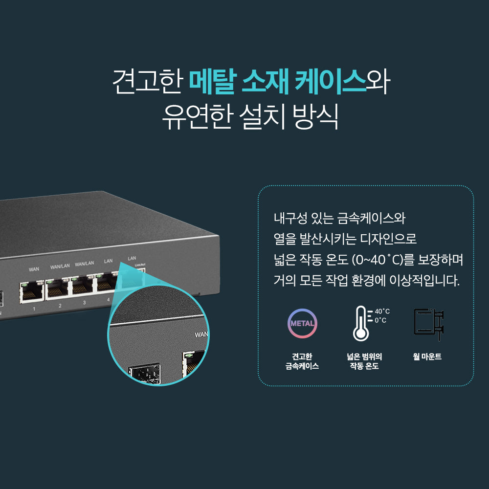 - 다양한 설치 방법을 지원하는 컴팩트 디자인: 똑바로 세우거나 뒤집어도 쓸 수 있고, 책상 거치, 벽면 설치, 천장 설치, 기둥 설치를 지원합니다.