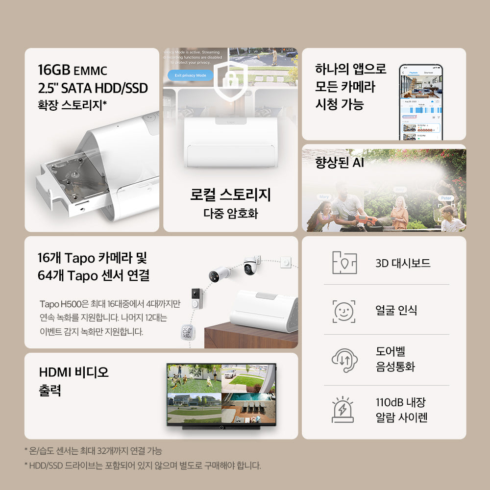 - 로컬 및 클라우드 스토리지: 녹화 영상을 microSD 카드(최대 512 GB)나 Tapo Care 클라우드 스토리지에 저장할 수 있습니다.