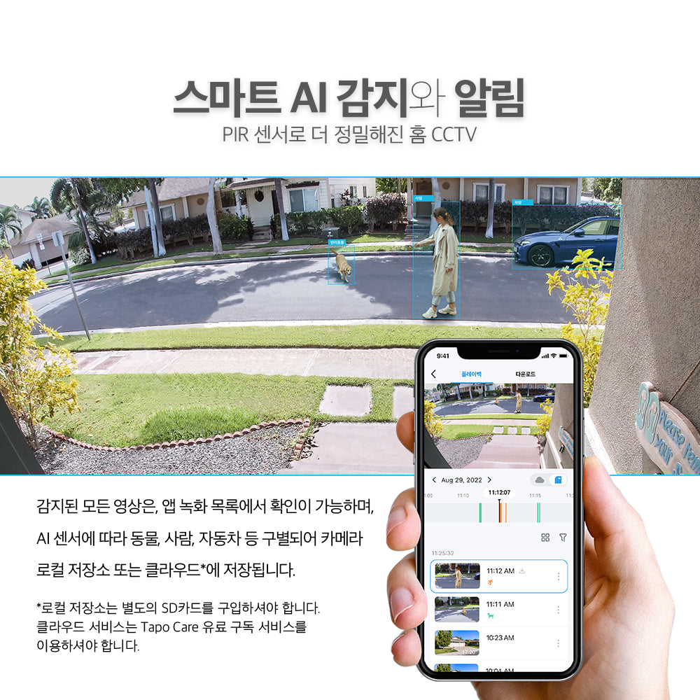 - 로컬 및 클라우드 스토리지: 녹화 영상을 microSD 카드(최대 512 GB)나 Tapo Care 클라우드 스토리지에 저장할 수 있습니다.