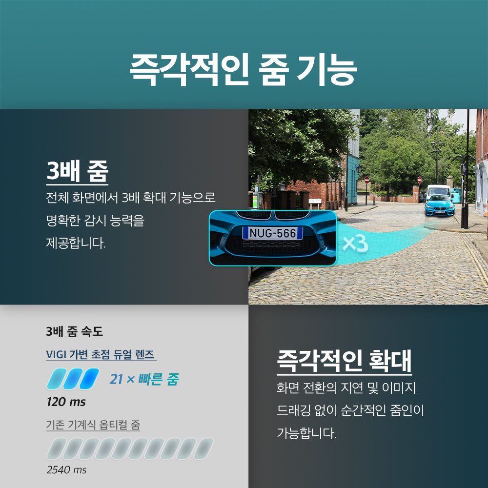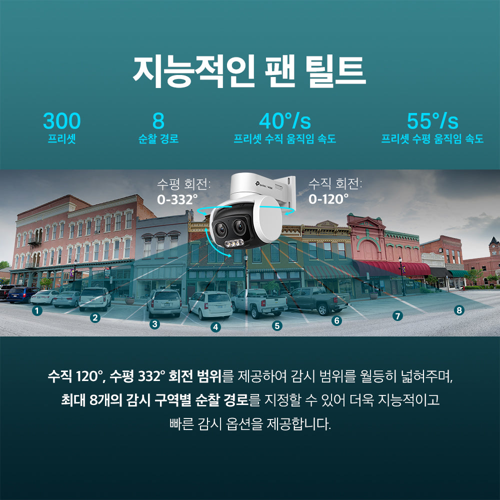 - 회전형: 360º 수평 범위와 146º 수직 범위로 각도를 조절해 더 넓은 영역을 모니터링할 수 있습니다.